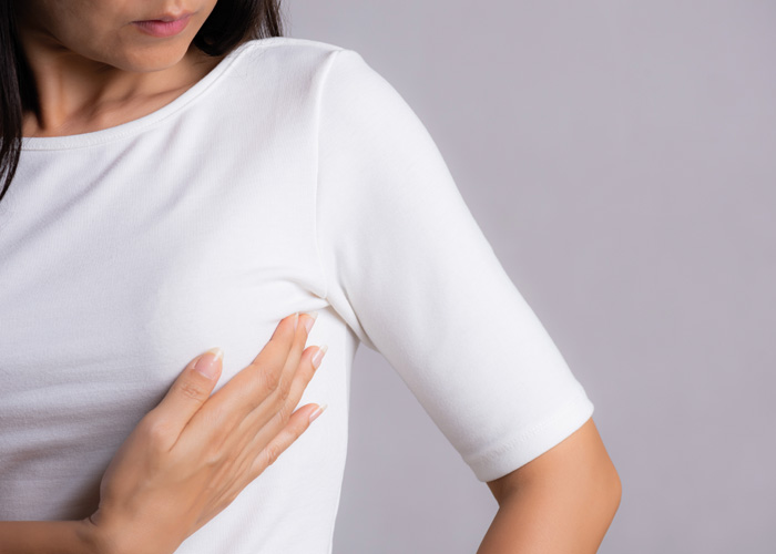 The first symptom most people notice is a lump or thickening in their breast or armpit. They may also sense a change in size, shape or feel of their breast, such as skin changes including puckering, dimpling, a rash or redness; changes in the position of the nipple; or fluid leaking from the nipple in a woman who isn’t pregnant or breastfeeding.