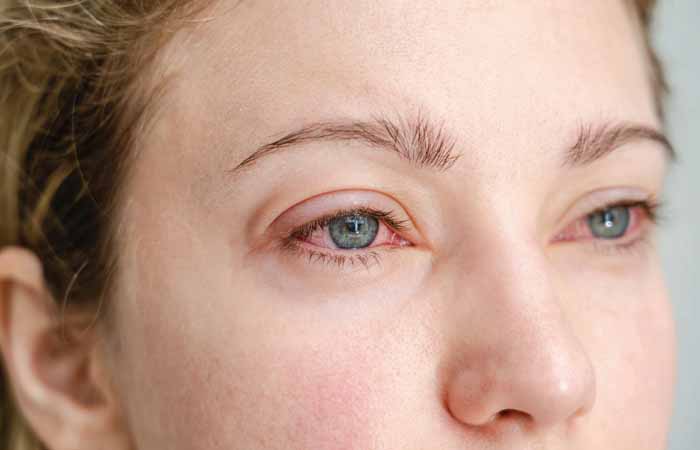 This is caused by a bacterial or viral infection and can be contagious. The whites of the eyes will look pink, and the eyelids may be red and swollen. Sufferers may also complain of a sticky, yellow coating or discharge on the eyelashes upon waking. One or both eyes may be affected.