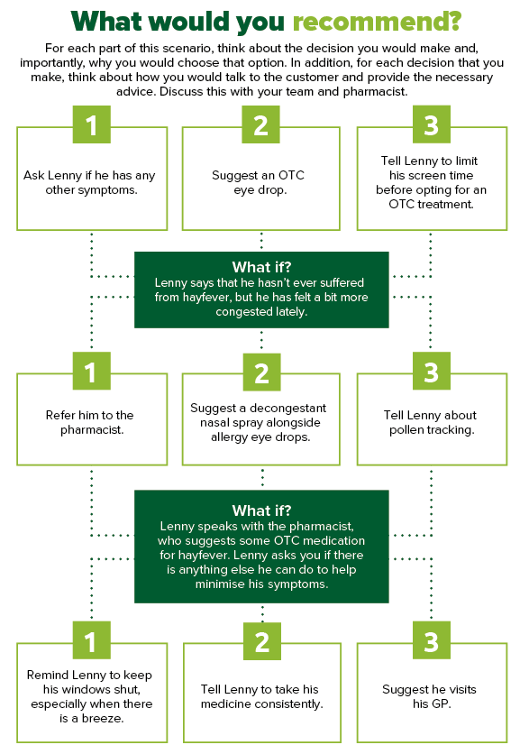 27-year-old Lenny comes into the pharmacy looking to buy some eye drops. He has had itchy eyes for over a week, but thinks he is just spending too much time looking at his computer screen.