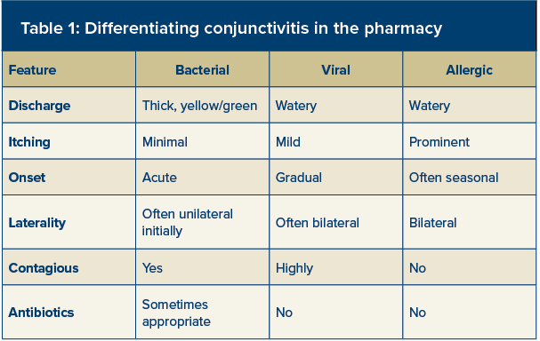 Itching is one of the most helpful distinguishing features. Prominent itching strongly suggests allergic conjunctivitis and should prompt consideration of antihistamine or mast-cell stabilising treatments rather than antibiotics.
