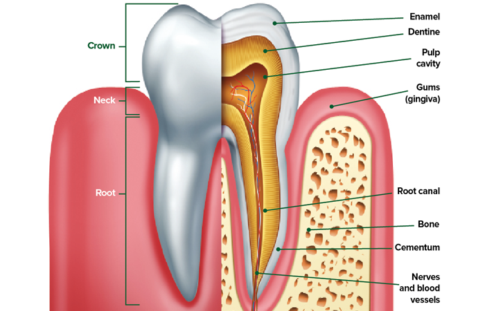 At the centre of the tooth is the pulp, which contains blood vessels and nerves. These nerve endings send messages to the brain – for instance, if something hot or cold is being eaten, or if a tooth is decayed or damaged.