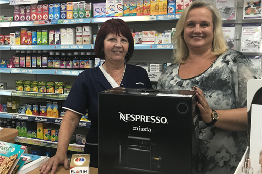 Pharmacy assistant Angela Steele from Bonymaen Pharmacy in Bonymaen, Swansea, was one of two winners to pick up a luxury coffee maker after completing a competition from new painkilling brand, Flarin. Angela is pictured with Powermed Plus territory manager, Tracey Glover.